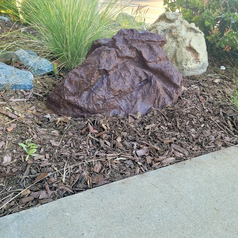 - Medium desert brown artificial fiberglass hollow rock measures 30 in. L x 20 in. W x 12 in. W for easy placement in any yard or landscape or easily hide water fixtures