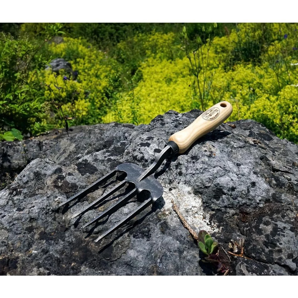 Innovative design meets old world quality in this DeWit Twisted Tine Hand Fork. The tines are made of hardened boron steel and are rotated as the tool is heated during the manufacturing process, making the tool extra strong and powerful. Won’t bend when digging rocks or pulling up roots. Tines are tapered, making it easy to dig and mix soil. Extra strong “Welldone” design makes it one of the strongest hand tools in the world. Works great in tough clay soil. Handle is made of hardwood ash and harvested from environmentally responsible FSC-certified forests.