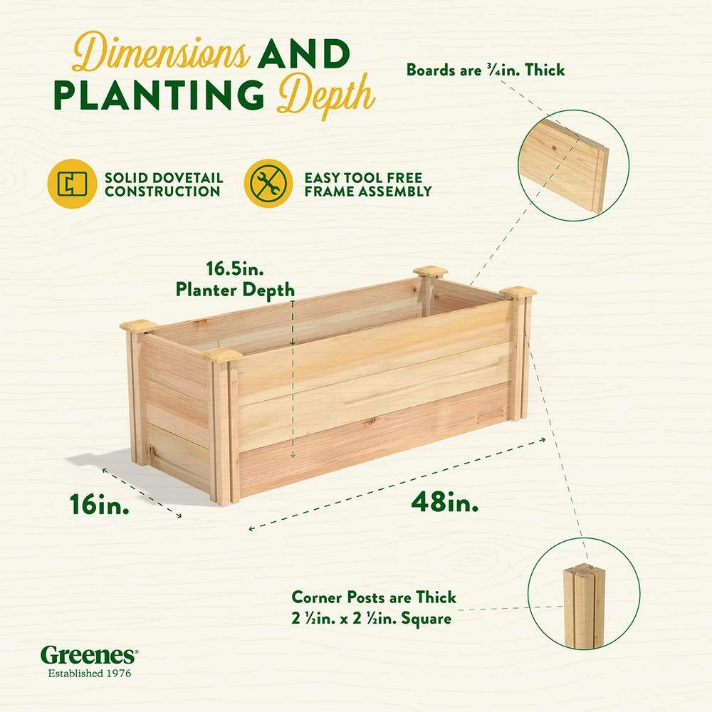 Grow all your favorite herbs, plants, and vegetables with Greenes 16 in. x 48 in. x 16.5 in. Premium Cedar Raised Garden Bed. The bed is made out of chemical free and naturally rot resistant North American cedar. It assembles without tools using the time tested and proven Greenes Fence Company dovetail design: simply slide the boards into the corner posts to form the frame, attach the caps, and then add soil, plants, and sunshine to start growing the garden of your dreams. Greenes Premium Cedar Raised Garden Beds use a 5.5 in. H board. Premium beds can stack and expand with other with other Greenes Premium beds, however they are not compatible with Greenes cedar raised gardens that use a 3.5 in. H board.