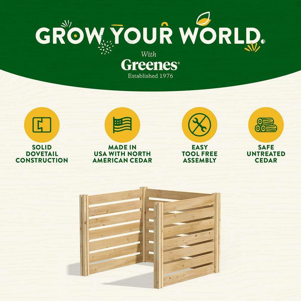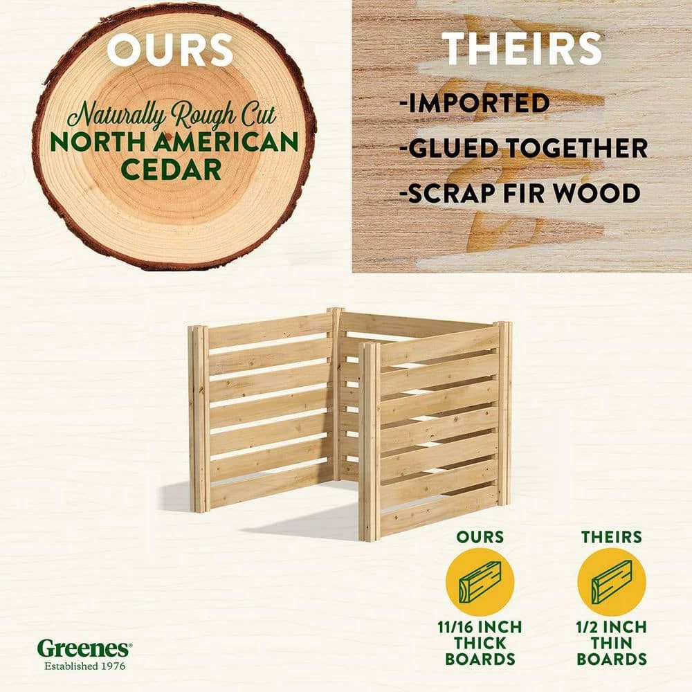 Here’s the simple, natural way to keep compost, outdoor air conditioning units, trash/recycling bins, pool pumps and such out of sight for a more beautiful yard. These 3-sided cedar frames with interlocking joints simply slide together without tools for quick assembly. 2 sizes make it easier than ever to conceal compost and all those essentials, as well as wood piles, outdoor furniture, sandboxes, wellheads. you name it. Greenes Fence 173.92 Gal. 3-Sided Cedar Wood Stationary Composter will help beautify your landscaping even as they match our other quality garden beds and accessories.