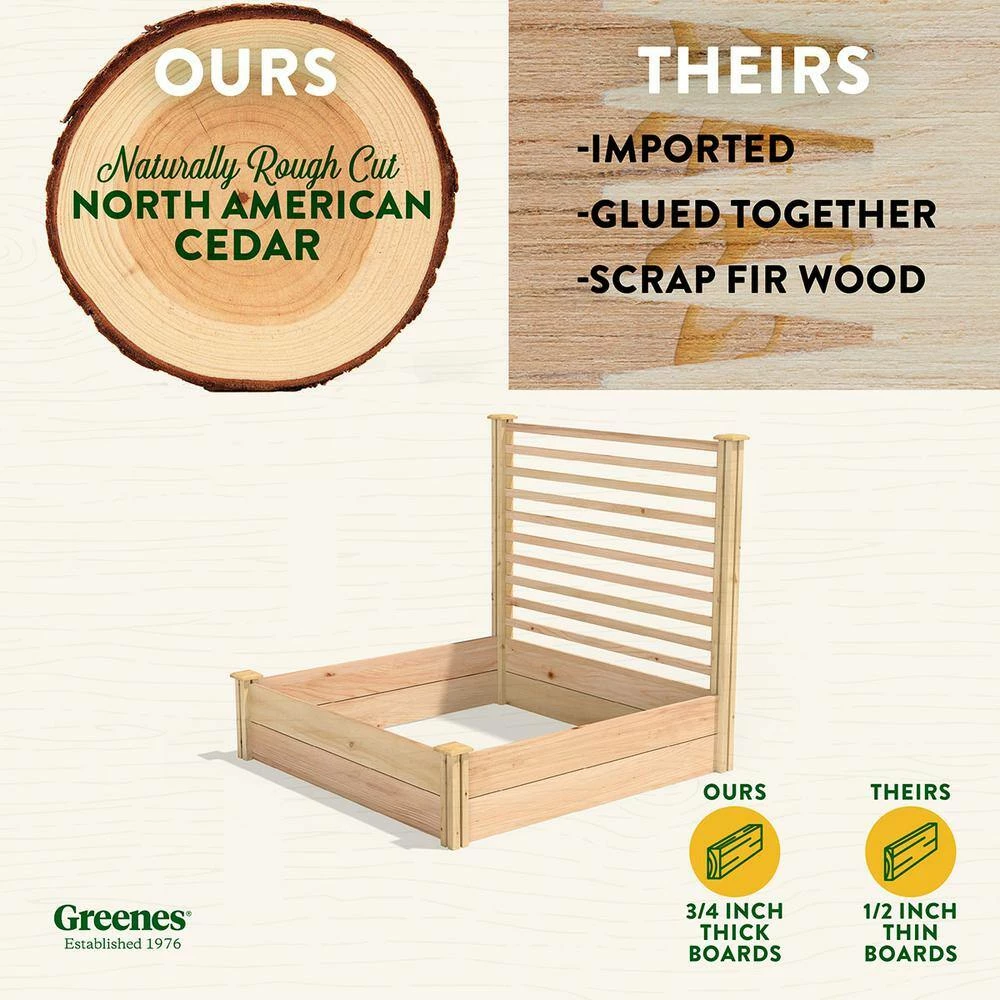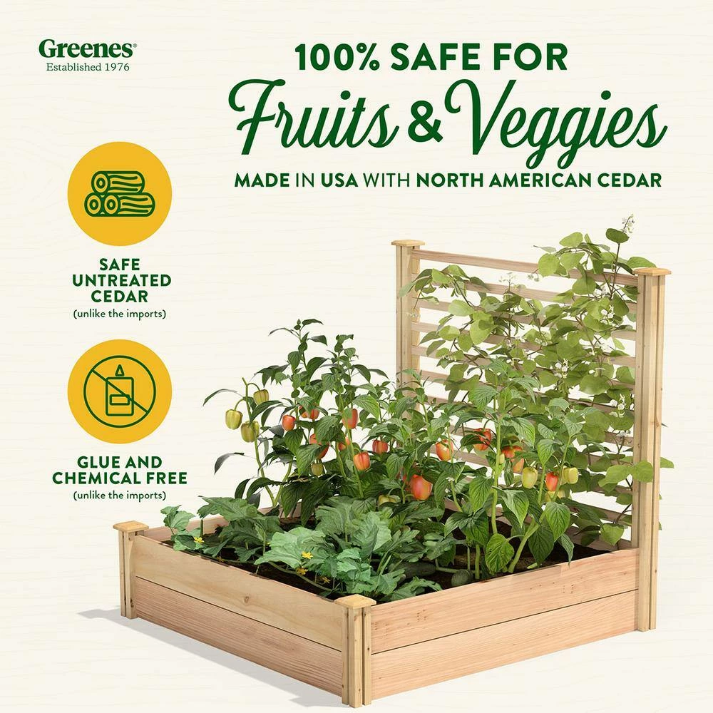 Greenes Premium line of Cedar Raised Garden Beds with trellis included make it easier than ever to grow that amazing garden you’ve always wanted. Our unmatched quality, durability and ease of assembly let you give your vegetables, herbs and flowers the room they need to grow and make planting, care and harvest so much easier. Untreated premium cedar frames with interlocking joints simply slide together without tools and the sturdy, graceful trellis provides support for climbers and vines. Let Greenes inspire your green thumb and get gardening the easy way.