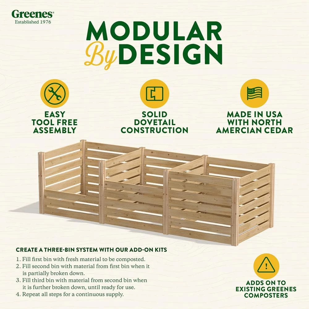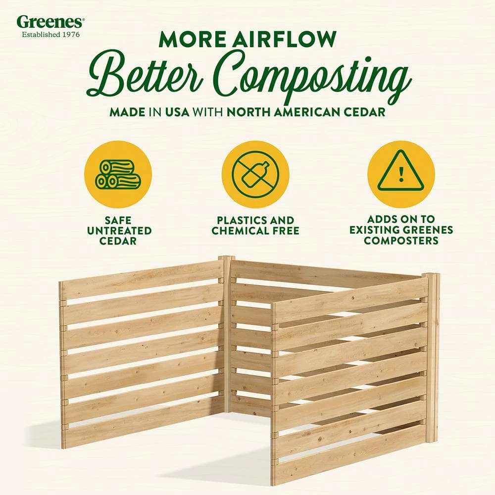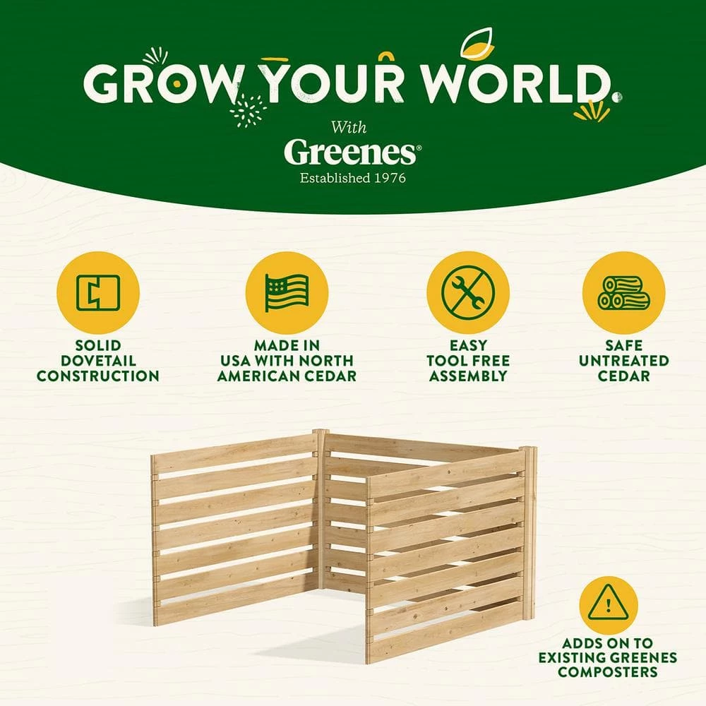 - Forms a 2-bins or 3-bins composting system with purchase of Greene’s standard and add-on kits