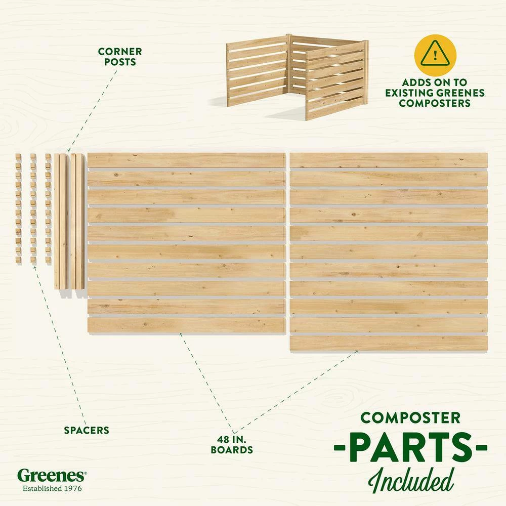 Turn your regular Greenes Composting Bin into a complete composting system with our Add-On Composting Kit. After the materials in your original composting bin begin to break down, move them to an attached add-on bin and start fresh with new materials in the first bin. A system of 1-Greenes Composting Bin and 2 add-on kits will keep your composting process moving seamlessly. Composed of 2-posts, 21-boards, and 36-spacers, this kit assembles with only a rubber mallet. It is available in (48 in. x 48 in. x 31 in. or 41.33 cu. ft.) to match your regular bin. Use a tarp or plywood (not included) to cover bins if desired.