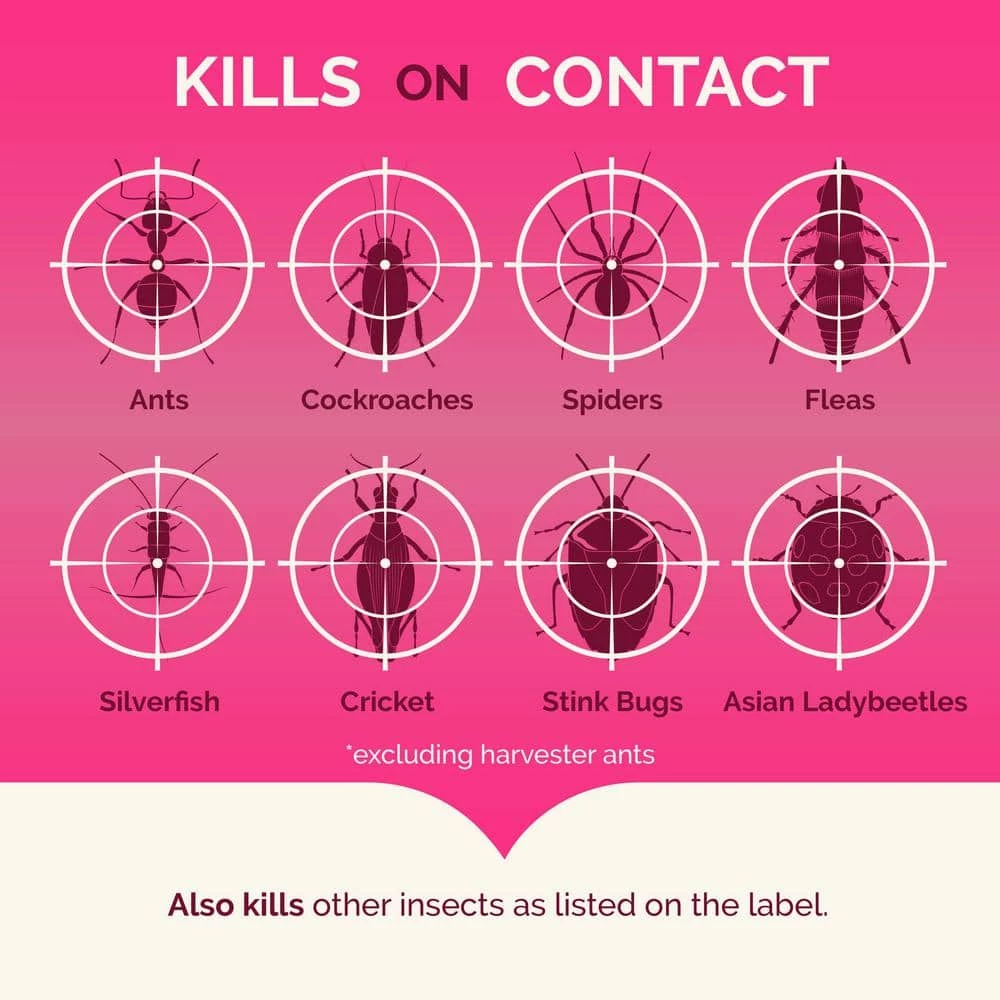- Kills insects indoors: this product kills ants, cockroaches, spiders, fleas, silverfish, firebrats, crickets, Asian ladybeetles, carpet beetles, waterbugs, palmetto bugs and stink bugs indoors