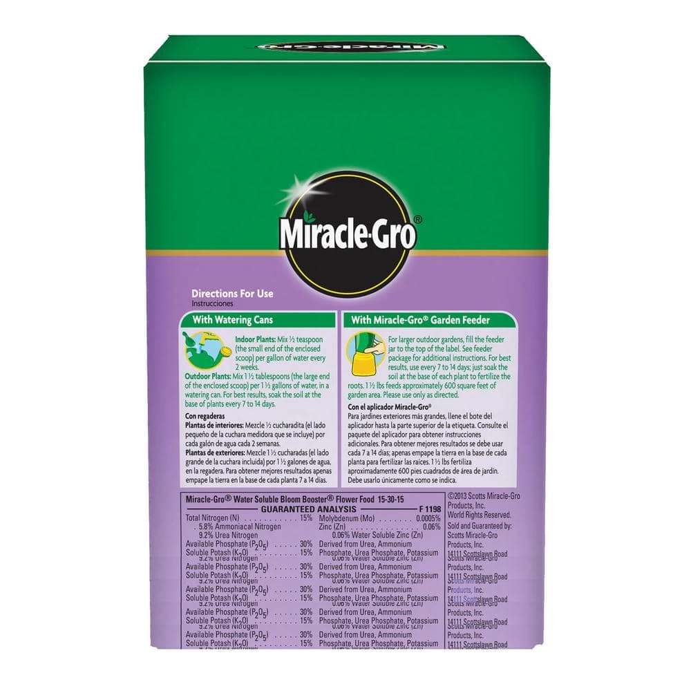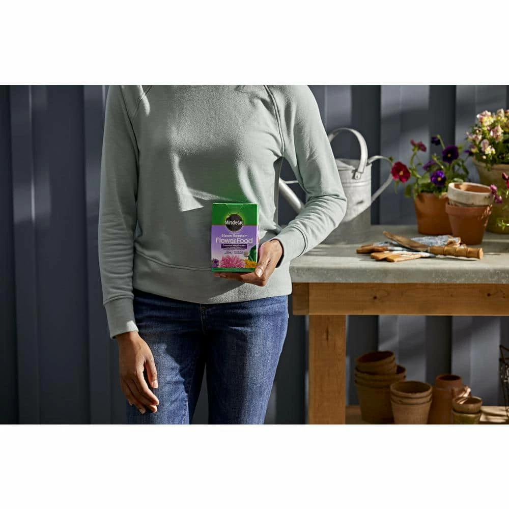 Miracle-Gro Water Soluble Bloom Booster Flower Food promotes more blooms for greater color compared to unfed plants. Use our flower food with the Miracle-Gro Garden Feeder or any watering can, and feed every 1-2 weeks. Get beautiful results with Miracle-Gro.