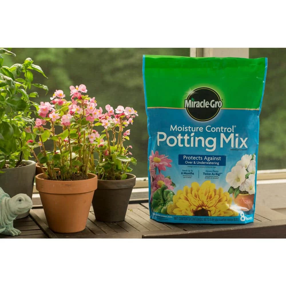Beautify your potted flowers with Miracle-Gro Moisture Control Potting Mix. Our specially formulated mix will feed your plants for up to 6 months and protect against over- and under- watering. It absorbs up to 33% more water than basic potting soil (vs. potting soil that does not contain sphagnum peat moss, coir, and wetting agent), so your plants can remain hydrated. Use it with indoor and outdoor container plants. Grows Plants Twice as Big (vs. unfed plants)!