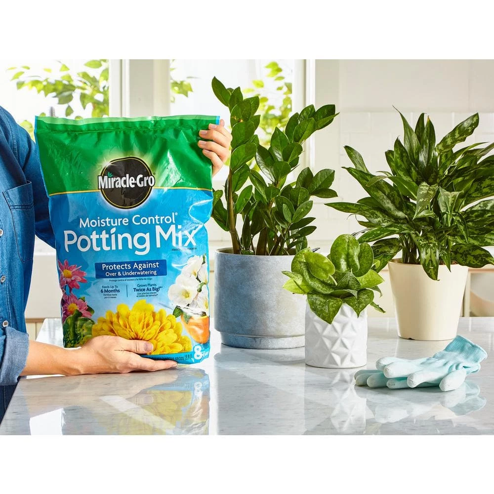 Beautify your potted plants with Miracle-Gro Moisture Control Potting Mix. This potting soil Grows Plants Twice as Big (compared to unfed plants)! and feeds your plants for up to 6 months. Our exclusive AquaCoir formula protects against over and under watering by absorbing up to 33% more water than basic potting soil (soil without sphagnum peat moss, coir, and wetting agent). One 8 quart bag of potting mix can be used to fill two 8 in. indoor or outdoor containers (amounts may vary). Since Miracle-Gro Moisture Control Potting Mix keeps your plants happy and hydrated, we recommend letting the soil dry to the touch in between waterings. We also encourage feeding your plants regularly with Miracle-Gro plant food thirty days after planting. All container plants should be repotted annually with Miracle-Gro Potting Mix to replenish nutrients and avoid soil compaction. Watch your indoor and outdoor container plants thrive with Miracle-Gro Moisture Control Potting Mix.