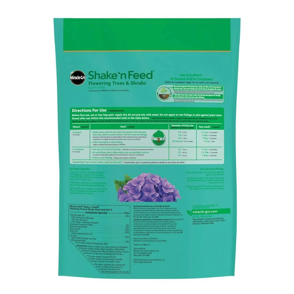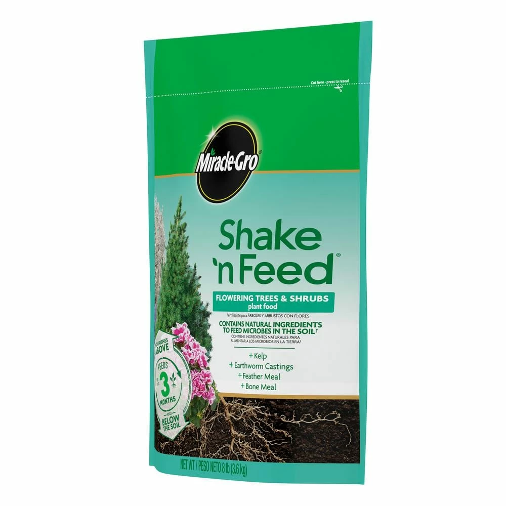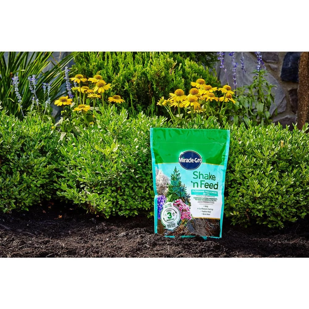 Miracle-Gro Shake ‘n Feed Flowering Trees and Shrubs Plant Food contains vital micronutrients, plus added natural ingredients, to nourish above and below the soil. It has been formulated with kelp, earthworm castings, feather meal and bone meal in an all-in-one particle to feed microbes in the soil. Microbes break down organic matter into nutrients that support root strength and development which increase water efficiency. Specifically designed for flowing trees, shrubs and other acid-loving plants to maintain deep, lush green foliage and colorful blooms throughout the season. You can use it anywhere: in ground and in containers. You can feed your plants for up to 3-months with the help of Miracle-Gro Shake ‘n Feed Flowering Trees and Shrubs Plant Food.