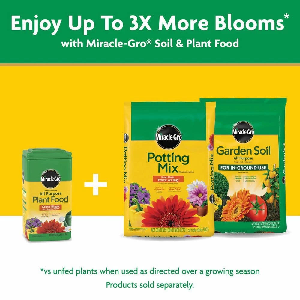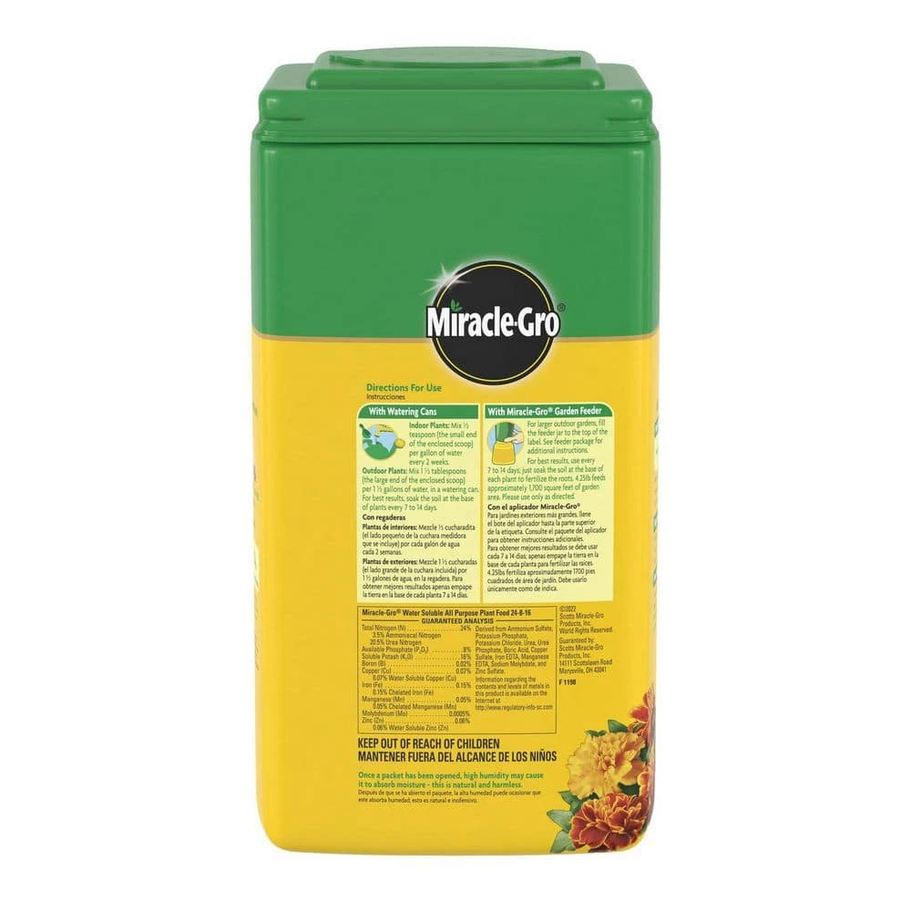 Miracle-Gro Water Soluble All Purpose Plant Food instantly feeds vegetables, trees, shrubs, and houseplants to grow bigger and more beautiful than unfed plants. Simply feed them every 1-2 weeks. The formula is safe for all plants, and is guaranteed not to burn when used as directed. Get beautiful results with Miracle-Gro.