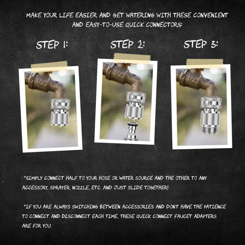 Make your life easier and get watering with these convenient and easy to use quick connectors. You just attach 1 half to your hose or water source and the other to any attachment, sprayer, nozzle etc. and just slide together. If you are always switching between attachments and have no patience to connect and disconnect each time, then these quick connect faucet adapters are for you. These are also amazing for those with limited joint mobility and arthritis. Includes: 6 Female and 6 Male water hose quick connect faucet adapters and 2 rubber hose washers. Universal Fitting: Use them to connect your hose to any faucet, nozzle, sprayer, RV, boat or power washer with a 3/4 in. fitting. They will fit most standard attachments and hoses. Made with nickel plated brass – Garden hose adapter set expertly crafted from the highest quality, solid brass for ultra-durability. Maintain water flow: These connectors won’t impede water flow and are constructed to last. They are made from durable and high-quality materials and fitted with a comfortable rubber grip.