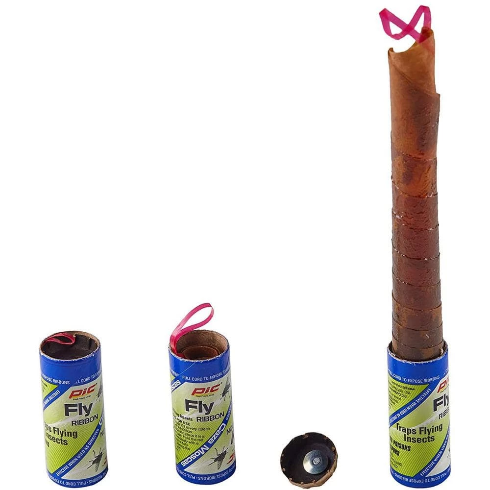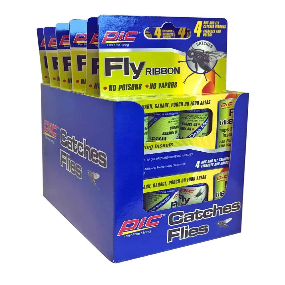 PIC Fly Ribbon, 4 Count, 1 Case (24 Packs for a total of 96) delivers the solution to all of your flying pest control needs. This convenient 96-pack offers plenty of ribbon to trap flies, gnats, mosquitoes and various other types of flying pests. The ribbons are safe, effective and easy to use and contain no harmful chemicals or poisons. The PIC Fly Ribbon is a non-toxic, odorless and poison-free solution for catching unwanted flying insects. Especially effective for flies, gnats, moths and mosquitoes, the PIC Fly Ribbon easily hangs and can be cut to your preferred length. The adhesive attracts flying insects and holds them in place. It is versatile and can be used indoors and outdoors.