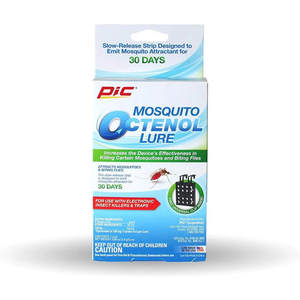 Enhance your device with the PIC Mosquito Octenol Lure, a mosquito attractant that imitates what mosquito receptors sense from human breath and sweat. The PIC Mosquito Octenol Lures attract mosquitoes and biting flies and by adding octenol to your devices, you can protect your friends and family from annoying flying insects and itchy bug bites. When used in conjunction with electronic insect killers and traps, the octenol lure increases the device’s effectiveness in killing certain mosquito species and biting flies. The slow-release strip is designed to emit mosquito attractant for 30-days. The-package includes 1 universal clip for quick and easy setup on an existing bug zapper or other electronic trap. Additional uses for the Octenol lure include placing the octenol pad in the catch tray of the PIC Solar Insect Killer Torch and PIC Insect Killer LED.