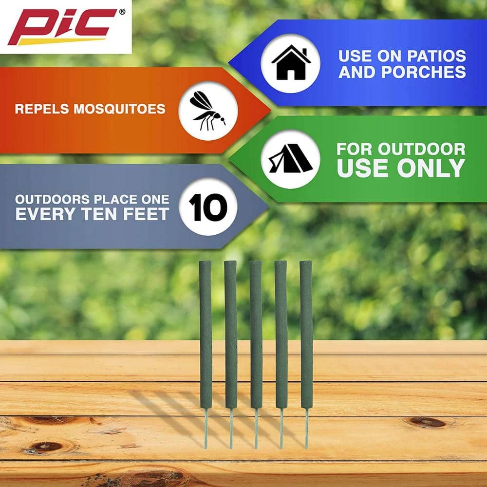 PIC Mosquito Repellent Sticks are effective and easy to use. Each stick is effective for up to 100 sq. ft. and burns up to 4 hours. Use more than one mosquito repellent stick to create a perimeter for a large area to repel mosquitoes. Mosquito Repellent Sticks help repel mosquitoes in confined areas outdoors. It is useful in places where there is little or no breeze such as patios and porches. Do not use indoors and see packaging for additional instructions for proper use. Sticks repel mosquitoes that may transmit zika virus and are effective when positioned every 10 feet. Each stick burns for up to 4 hours and is best used outside on patios and porches. For outdoor use only. Note the direction of any breeze or wind when placing the stick around outdoor activity.