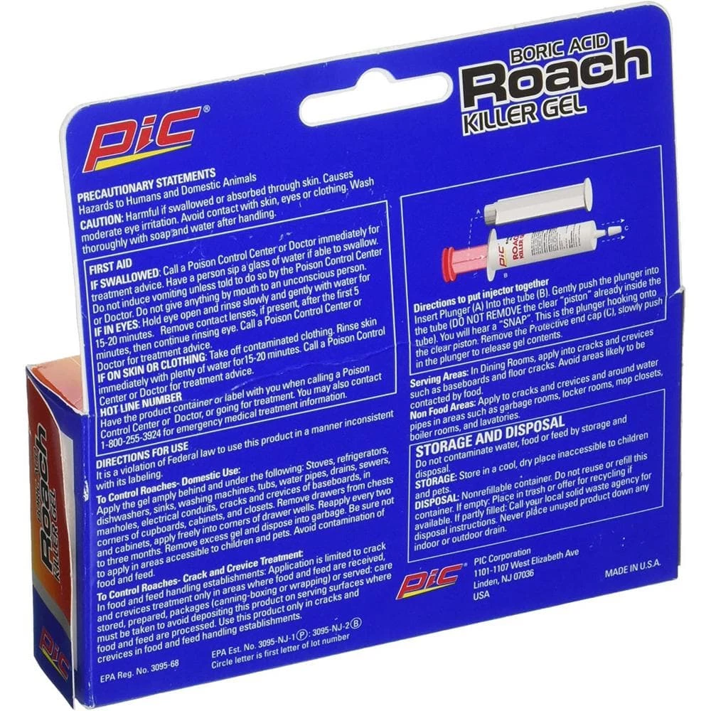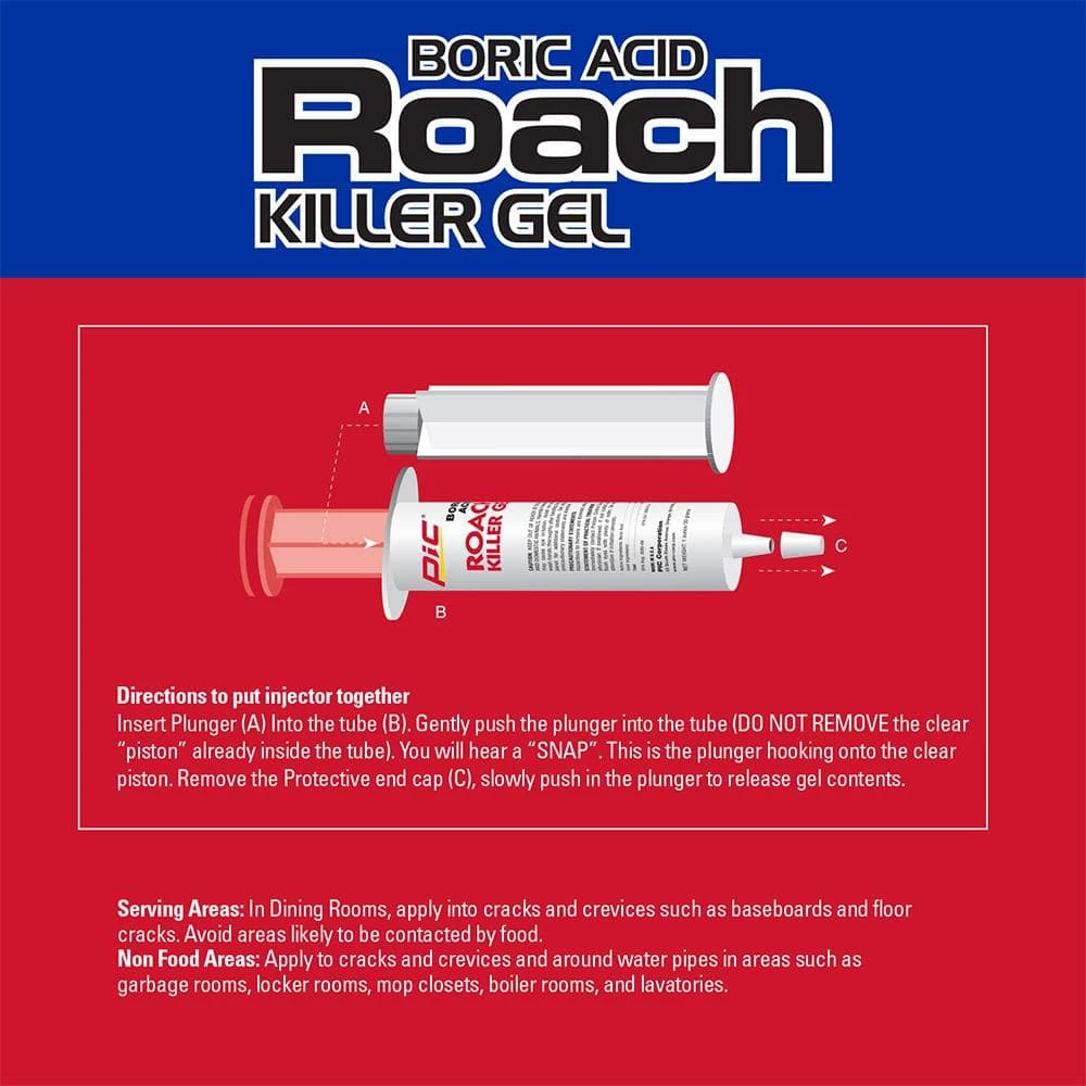 The PIC Roach Killer Gel using Boric Acid is a traditional method to eliminating roach and ant infestations. With the injector and plunger, the gel is easily administered to cracks and crevices for a more discreet application in areas where roaches can traffic. To control roaches, it is recommended to apply the gel amply behind and under stoves, refrigerators, dishwashers, sinks, washing machines, tubs, water pipes, drains, sewers, electrical conduits, cracks and crevices of baseboards as well as cabinets and closets. The key to eliminating roaches is to apply the gel in dimly lit areas where roaches tend to hide and travel. When applying PIC Roach Killer Gel in kitchens and near food preparation areas, be sure to the follow the instructions on the packaging. Do not apply the gel anywhere food contamination can occur.