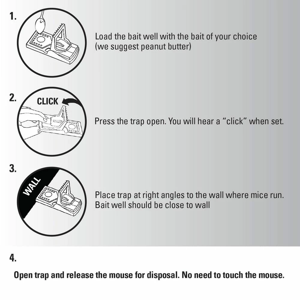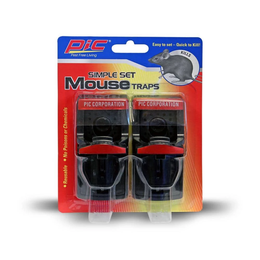 PIC Simple Set Mouse Traps are easy to use, just press it and it sets. No caught fingers, snaps open for disposal and is extremely effective. The deep bait well allows you to fill it with peanut butter, chocolate, or any other sweet attractant.