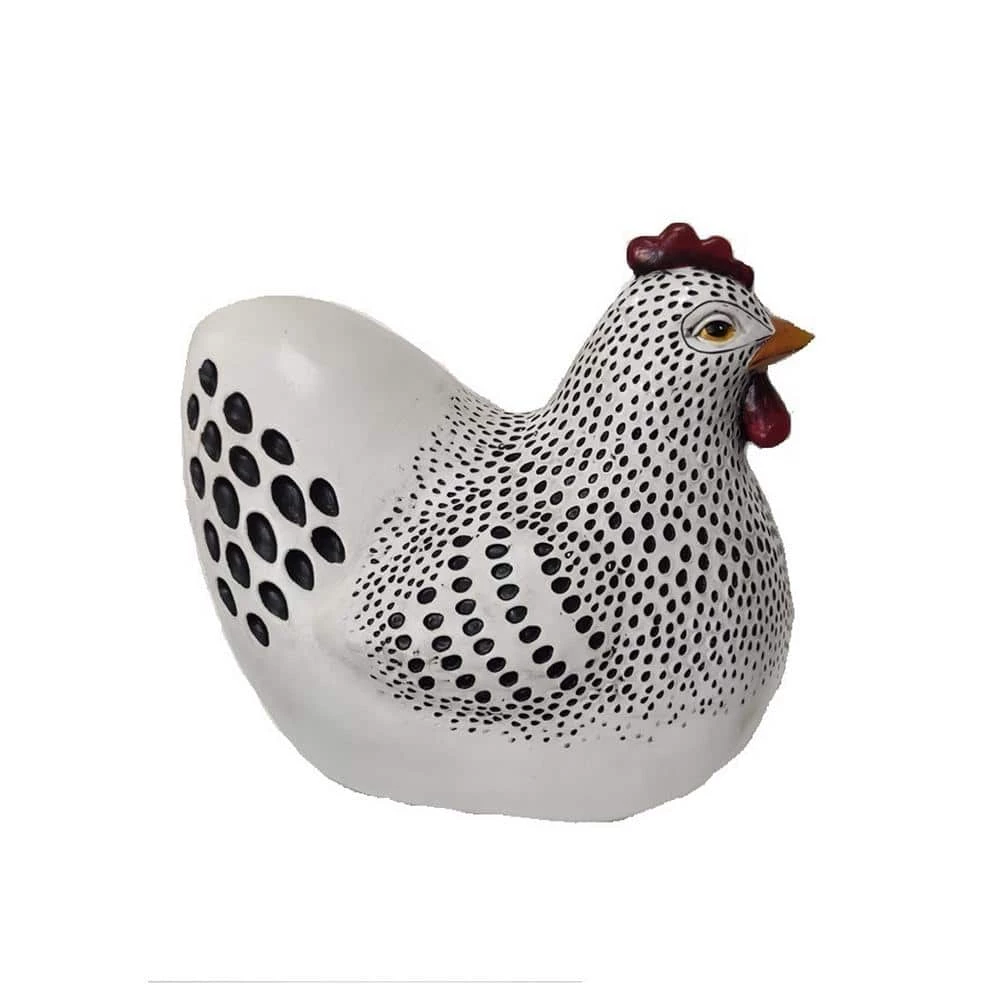 If you’ve ever been around chickens, you know how entertaining it is to just sit in the shade and watch in chicken TV in on a warm summer day. Then toss them a slice of watermelon and watch the feeding frenzy. So much fun. This lovely black and white spotted chicken is doing her daily duty and taking a break from the mayhem to lay an egg. Made of long-lasting resin and beautifully hand painted with exquisite detail, this 7 in. Lying Appenzeller Chicken is sure to provide many seasons of pleasure.
