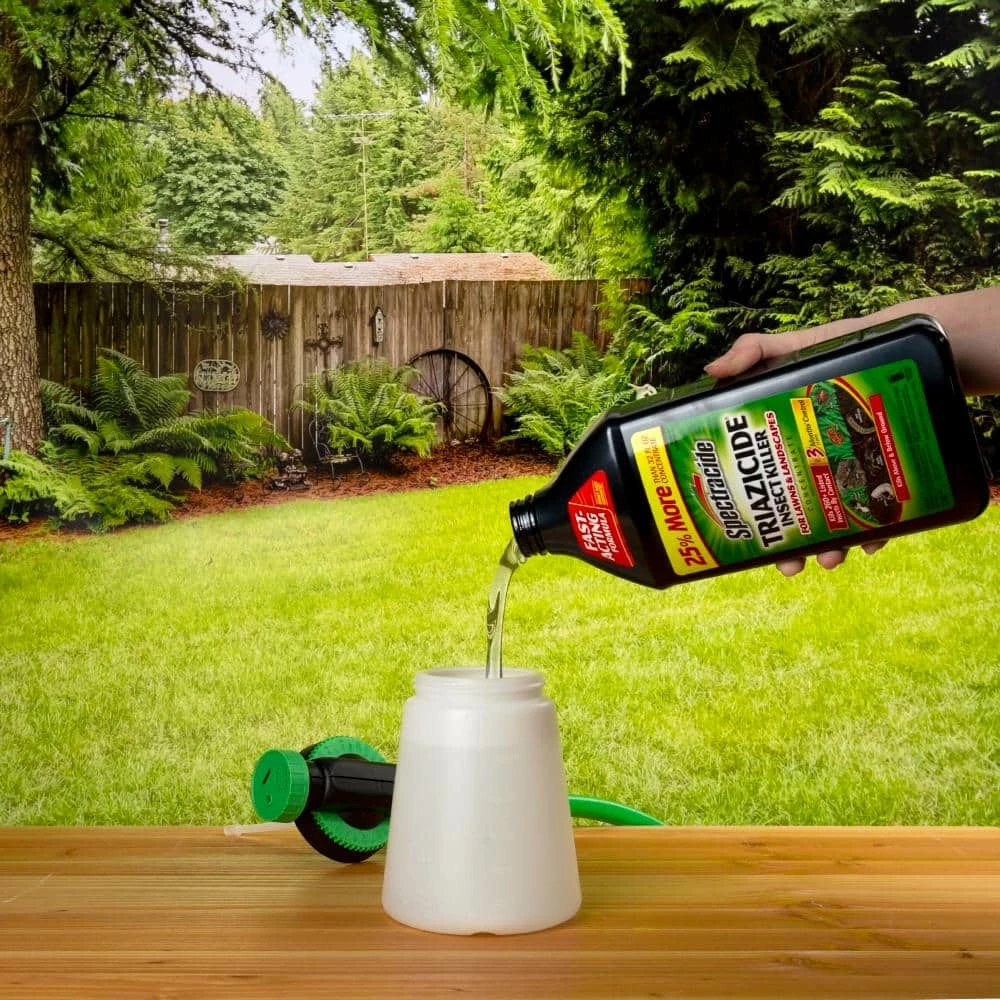 The power is in your hands to keep your landscape in line – unleash it with Spectracide lawn and garden products. Our easy-to-use, fast-acting insect, lawn disease and weed control solutions help you tame lawn and landscape invaders with incredible pest-punishing power. Take command with Spectracide brand. You hold the power.Spectracide Triazicide Insect Killer For Lawns & Landscapes Concentrate protects lawns, vegetables, fruit and nut trees, roses, flowers, trees and shrubs with a formula that controls insects above and below ground. It controls more than 260 listed insects by contact, including grubs, ants as listed, fleas, deer ticks, Japanese beetles, European crane flies and other listed insects. This concentrate formula is designed to be mixed at the rates listed on the label and applied with a tank sprayer (sold separately). This 40-ounce concentrate covers up to 6,400 sq ft of lawn for surface insects including fleas, cockroaches, Palmetto bugs, water bugs and other listed insects.For best results, apply this formula early before insect populations are high. Wet leaves and branches to the dripping point. Try to spray the underside of leaves and penetrate dense foliage. Be sure to follow the important use limitations for the specific vegetable you are treating, including the intervals between treatments and the days to wait before harvest.