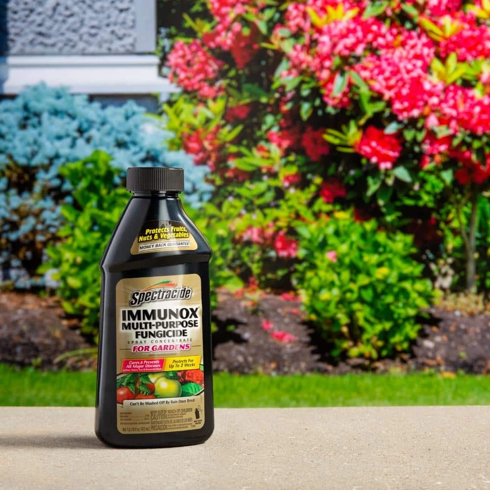 The power is in your hands to keep your landscape in line – unleash it with Spectracide lawn and garden products. Our easy-to-use, fast-acting insect, lawn disease and weed control solutions help you tame lawn and landscape invaders with incredible pest-punishing power. Take command with Spectracide brand. You hold the power.Spectracide Immunox Multi-Purpose Fungicide Spray Concentrate For Gardens cures and prevents all major diseases on roses, flowers and ornamental shrubs. One treatment protects for up to 2 weeks. This concentrate can’t be washed off by rain once dry. Use it to control brown patch, powdery mildew, black spot, rust, blights, leaf spot, mold, scab and more on ornamentals, lawns, trees, fruits, nuts and vegetables as listed.This concentrated formula is highly effective when used to prevent diseases or when applied at the first sign of disease. Consider treating early in the season. Apply once every two weeks throughout the season until conditions favoring disease development (hot, humid weather) are no longer present. For fruits, nuts, berries and vegetables, treat as directed on the label for your particular type. Mix with water in a garden sprayer (not included) at the rates directed on the label.