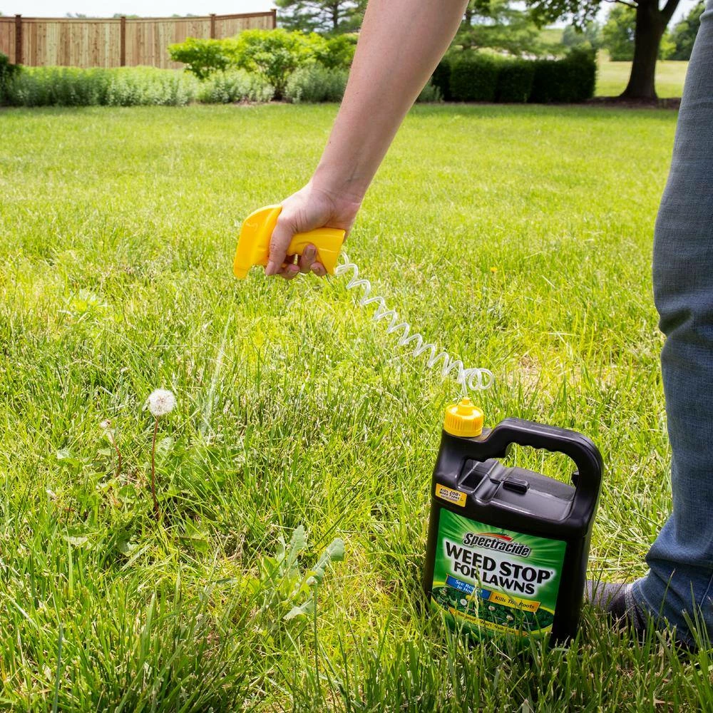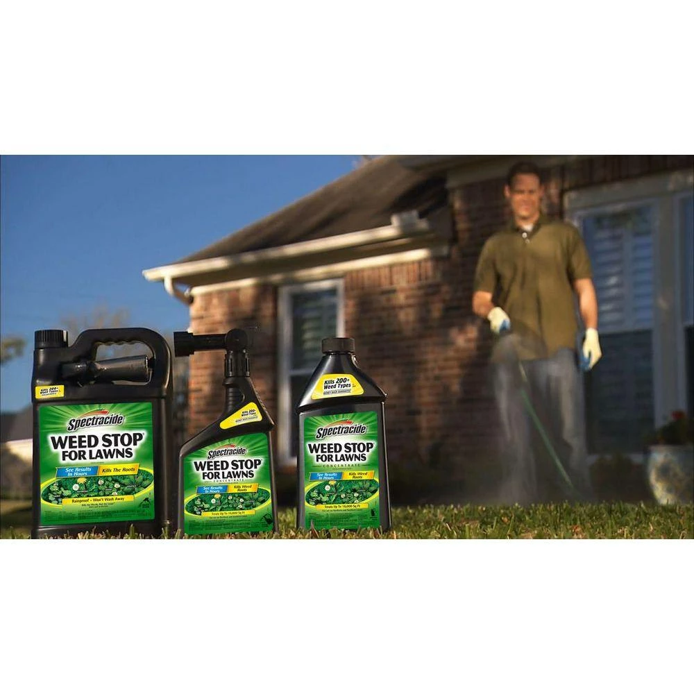 The power is in your hands to keep your landscape in line – unleash it with Spectracide lawn and garden products. Our easy-to-use, fast-acting insect, lawn disease and weed control solutions help you tame lawn and landscape invaders with incredible pest-punishing power. Take command with Spectracide brand. You hold the power.Spectracide Weed Stop For Lawns controls more than 200 types of weeds as listed – and it won’t harm your lawn when used as directed. This ready-to-use formula kills down to the root, with visible results in hours – weeds will begin wilting and browning overnight. It controls major broadleaf weeds, including dandelion, chickweed and clover, and also kills poison ivy, poison oak, blackberry and kudzu (see product label for complete list). This product is rainfast in 6 hours, so it won’t wash off. This ready-to-use formula is ideal for spot treatments – requires no mixing.Some hard-to-kill weeds may require re-treatment. Wait at least 30 days between applications – some weeds can take that long to die. Spray just enough Spectracide Weed Stop For Lawns to lightly cover weeds – for best results, apply when daytime temperatures are between 60 and 85 degrees. Do not apply when daytime temperatures are above 85 degrees as lawn injury can occur. Read the entire label before using.